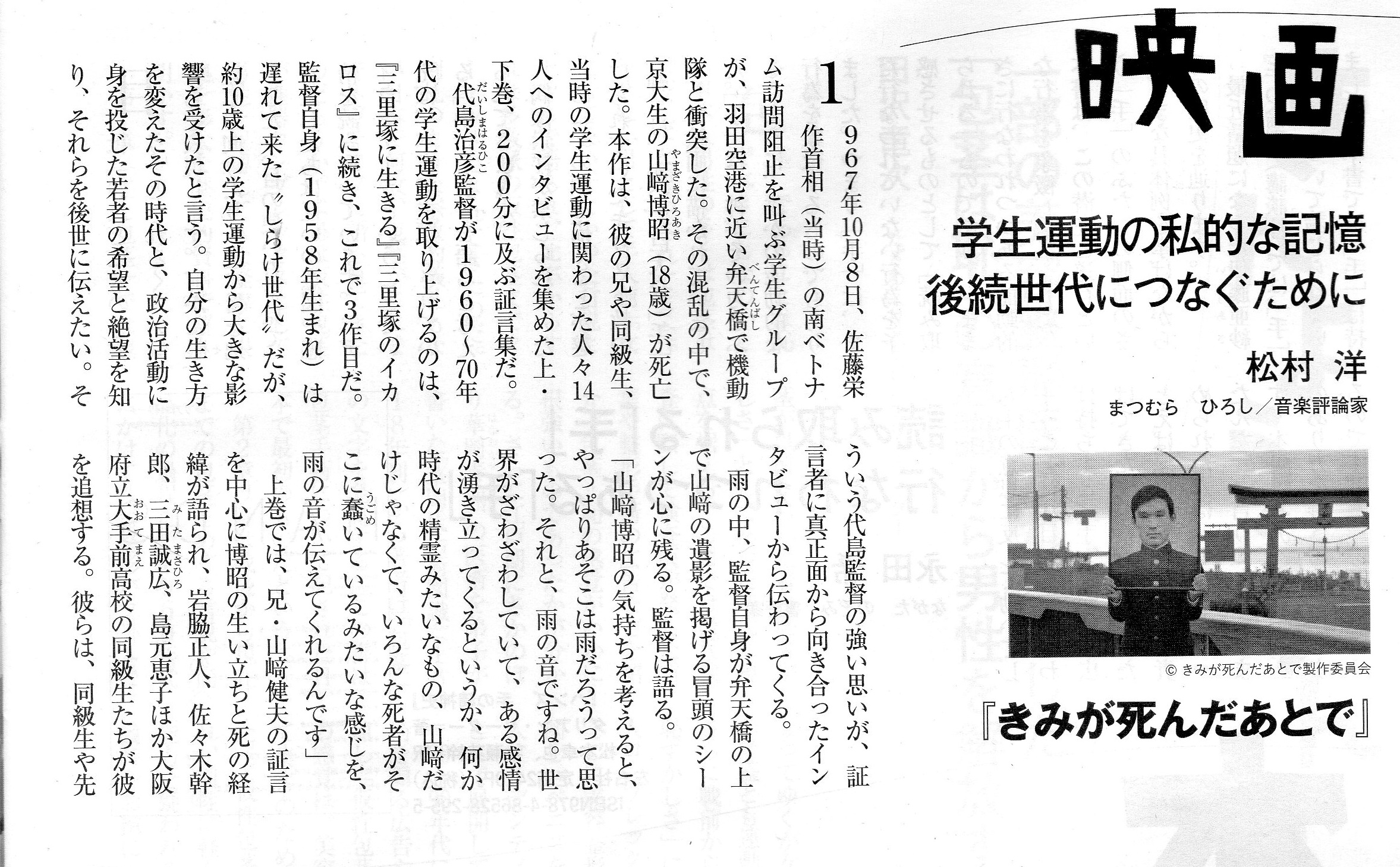 代島治彦監督作品「きみが死んだあとで」の公開にあたって、週刊金曜日(4月2日号)に松村洋氏による映画評が掲載されました。とても的確で、映画の感動が伝わってくる批評です。