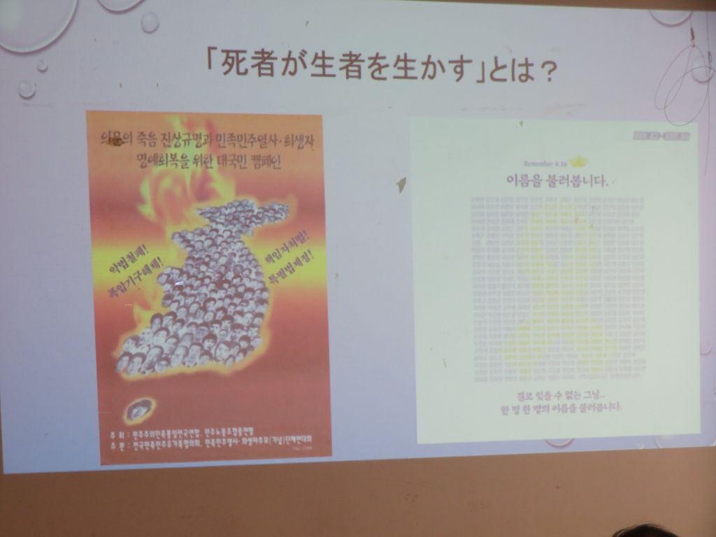 だから「精神の継承」と言う場合、それはこれを継承しようとする者たちに一つのエートスを与える、弁証法的な運動へと動機づけていく、そういう言葉じゃないかなというふうに私は思っています。韓国で死者が生者を生かす状態に至るまでの、日本ではほとんど見過ごされているこのプロセスには、死者を生かすために自ら犠牲となった無数の生者たちの生き死にがあり、そしてその一人一人に対して「精神の継承」ということが言われてきた。それがさらに人々を内面から駆り立ててきたという、そういう背後があったということを、多くの人にご理解いただきたいなというふうに思っています。