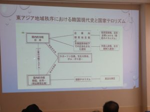 このように暫定的に作成した東アジア地域秩序の概念図の中で、韓国社会というのは実は国家テロリズムによる心的外傷を数えきれないほど負わされて、そしてその心的外傷後をずっと生きてきたのではないかと思っています。そのこともレジュメにまとめていますが、具体的な出来事、主なものだけですが挙げておきました。