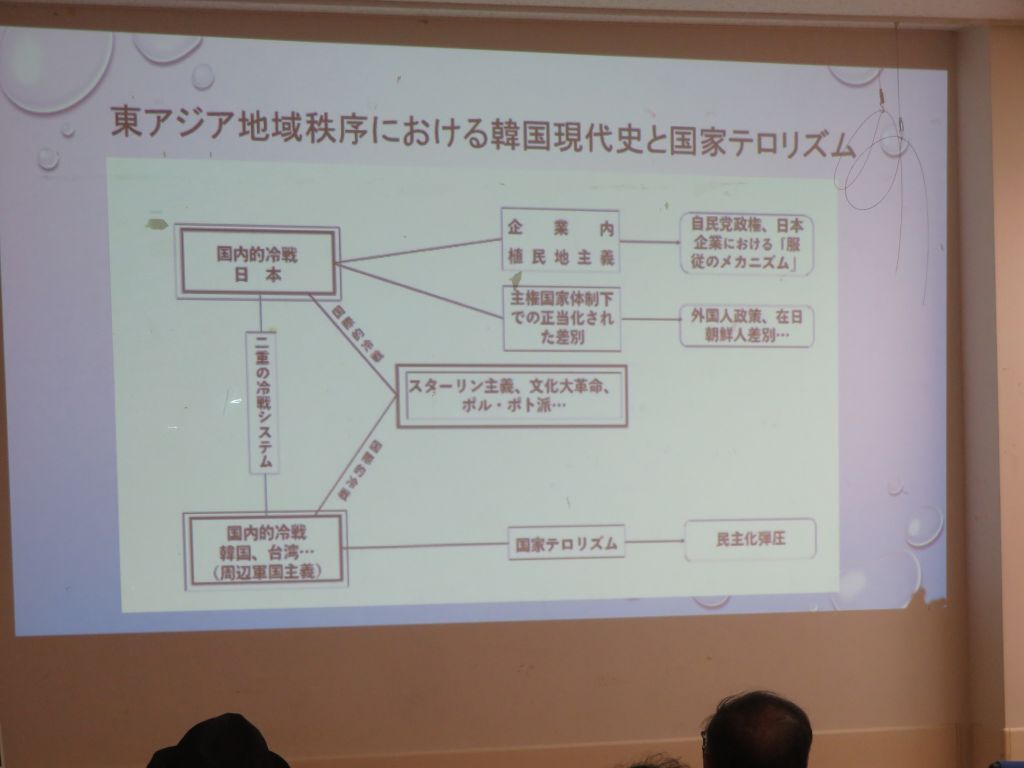 次に、尹錫悦(ユン・ソンニョル)の戒厳事態というのがどういう背景のもとでなされたかについてです。これは「東アジア地域秩序における韓国現代史と国家テロリズム」をめぐる概念図としてレジュメにも載せましたけど、これは私が暫定的に作った図式で、徐勝(ソ・スン)先生、纐纈(こうけつ)厚先生や、日立就職差別を闘われた朴鐘碩(パク・チョンソク)さんなどの論文を参照しながら作ったものです。