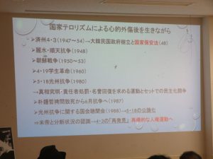 光州自体もずっと無かったこととして押さえ込まれてきたのが、8年がかりでようやく公論化された。「ホロコーストはホロコーストの記憶の破壊によって初めて完成する」という高橋哲哉氏の言葉がありますが、光州にせよ済州にせよ、ホロコーストはまさに完成されようとしていたわけです。